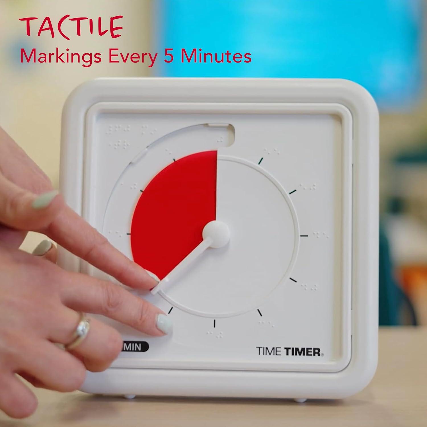 Time Timer® Braille 8” timer: Built with the highest contrast disk possible and braille numbers, the open-face design allows for a tactile experience to aid in setting the timer while also encouraging Braille education. The high contrast disk allows for low vision users to discern the time remaining. Audible final alert optional.