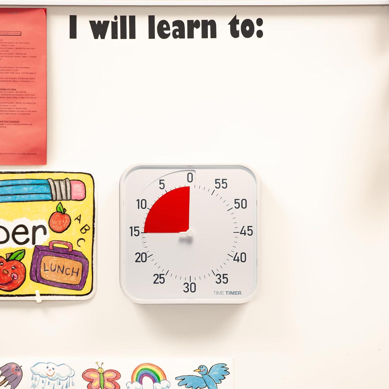 Bring structure to large classrooms, therapy rooms, or shared learning spaces with this 60-minute visual timer. The bold red disk delivers high-contrast visibility, helping students and adults quickly recognize elapsed and remaining time. The modern white frame updates the classic Time Timer look, blending into clean, organized learning environments. The oversized 12-inch face allows time to be seen clearly from across the room, while silent operation and an optional alert support focused learning. This updated Original 12″ builds on the brand’s 30-plus-year legacy—first introduced by Jan Rogers in 1994—and adds teacher- and therapist-friendly tools for today’s learning environments. It includes an oversized Next Steps™ Dry Erase Activity Card to support visual schedules and routines. It also includes limited-time access to the Premium version of the Time Timer App. Highly visible and easy to display, the 12” Original fits seamlessly into modern classrooms and professional spaces.
